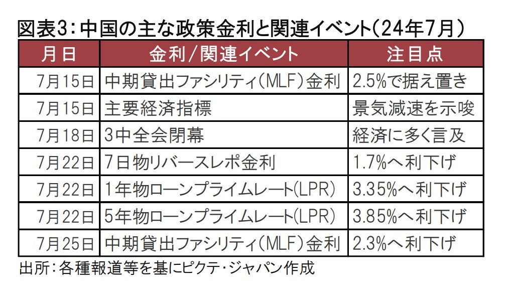 短期的な注目点は、3中全会が24年の経済成長率目標の達成を強調したことです。通常、3中全会は長期的なテーマが取り上げられることが多く、年後半の(短期的な)経済に言及するのは異例です。3中全会後に利下げが発表されたのは、これを反映したものと思われます。