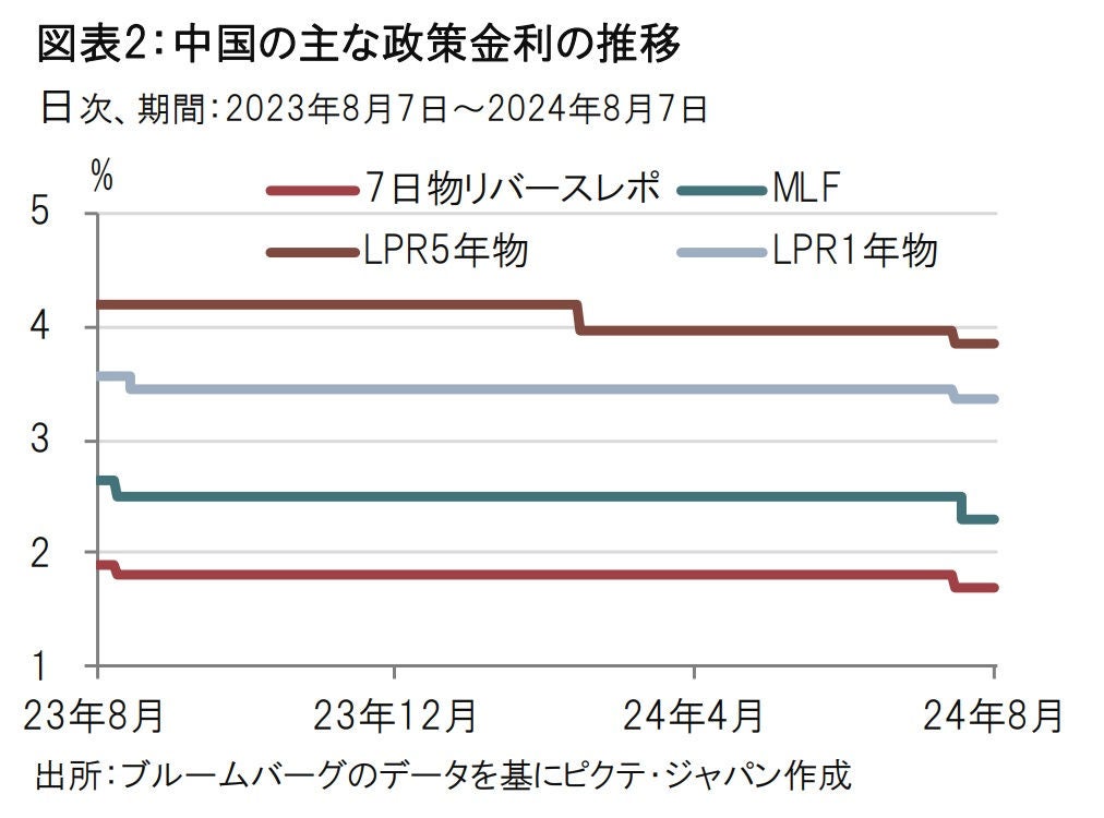 人民銀は7月18日に7日物リバースレポ金利を、市場予想の据え置きに反し1.8%から1.7%へ引き下げました(図表2、3参照)。同日には最優遇貸出金利(LPR、ローンプライムレート)の1年物に加え、住宅ローン金利などの目安となる期間5年超のLPR金利が0.1%の幅で引き下げられました。また。25日には15日に据え置かれていたMLF金利を2.5%から2.3%へと引き下げました。