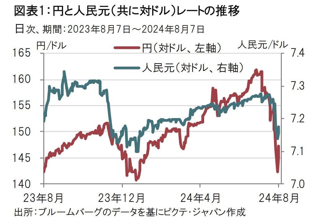日銀が利上げを決定したことは円の調達コスト上昇要因となり、素直に円キャリー取引が解消する背景となったとみられます。一方、人民銀は図表2にあるように金利を引き下げる方向で政策運営しており、元キャリー取引にとっては有利で、ポジション解消は必要がないようにも思われます。それにもかかわらず、円と人民元がキャリー取引解消で同方向に動いた背景は、元の変動性が急速に高まったことや、円キャリー取引の解消により投資先の高金利債券が売られたことから、元キャリー取引でも解消が進んだためとみられます。また、金利引き下げ幅も概ね0.1%程度では、その影響は限定的であったのかもしれません。