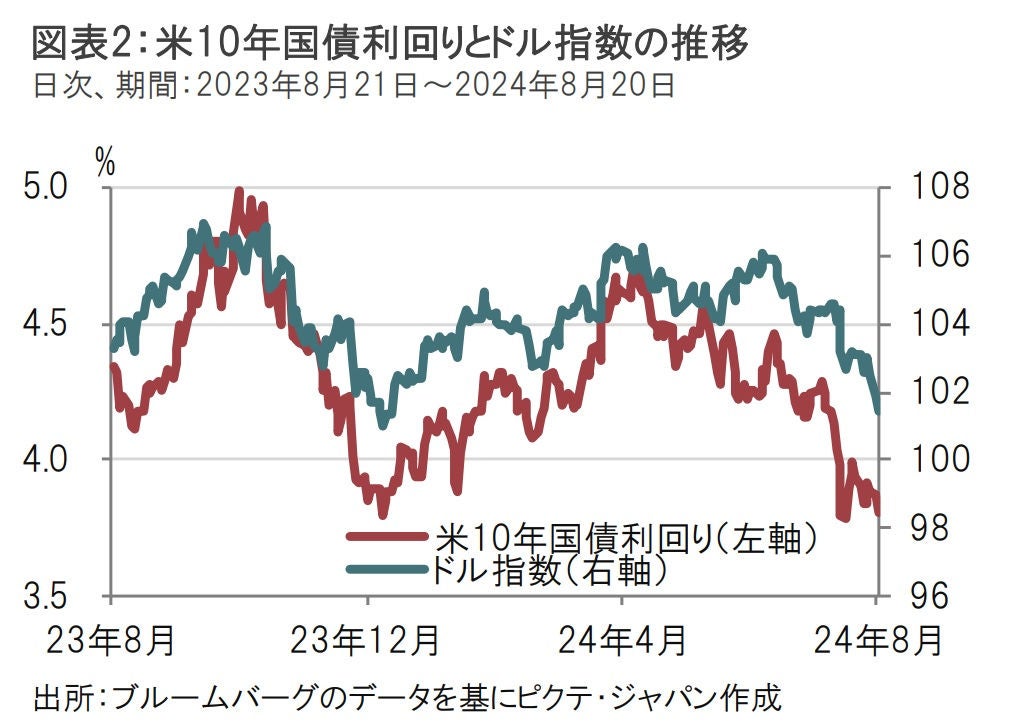 米10年国債利回りは24年年初から4月頃まで上昇傾向でした(図表2参照)。1-3月期の米消費者物価指数(CPI)が再加速の兆しを見せたこと、雇用統計が堅調であったことなどが背景です。しかし、その後物価は減速傾向に転じ、雇用統計も市場予想を下回ることが多くなり、国債利回りは低下傾向に転じました。このような中、市場は9月の米連邦公開市場委員会(FOMC)における利下げ開始を織り込んでいます。