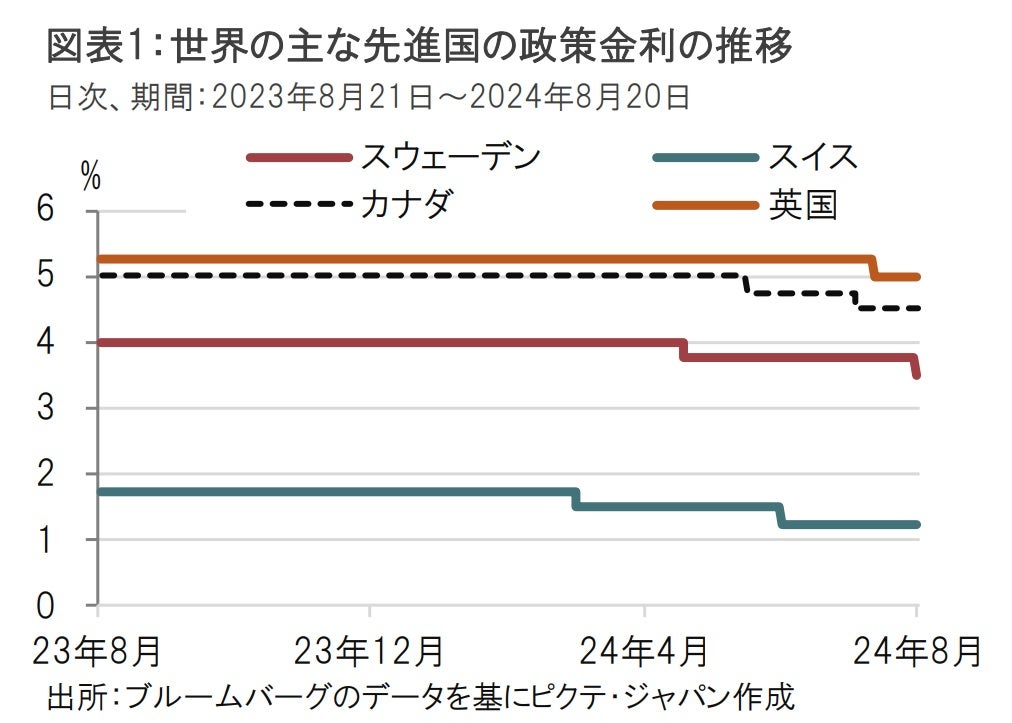 世界的にインフレが鈍化傾向となる中、スイス中銀は早くも3月21日に利下げを開始し、6月20日に追加利下げを実施しました。カナダ中銀は6月に利下げを開始し、7月に追加利下げを実施しました。英国中銀は8月に利下げを開始しました。