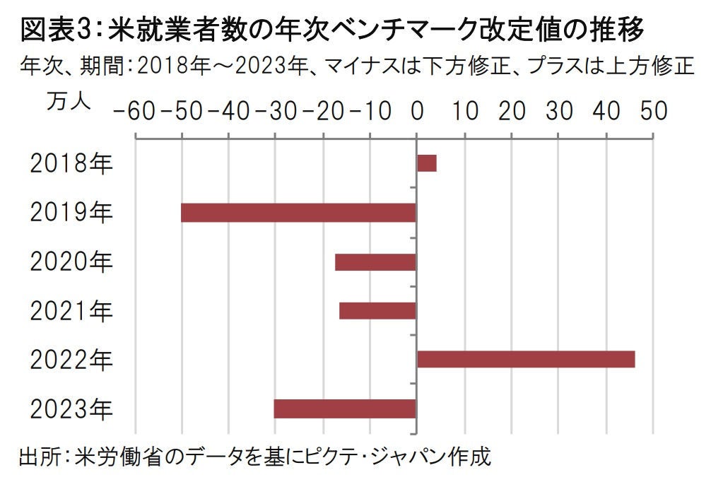労働市場についてはすでに公表された雇用統計に加え、21日(日本時間午後11時)に米労働省が発表する雇用統計の年次ベンチマーク改定が注目されています。非農業部門就業者数の24年3月までの1年間の修正分が発表さる予定です(図表3参照)。23年は30.6万人分下方修正されました。23年3月までの1年間の雇用の伸びは月平均で約33.7万人増でした。しかし30.6万人分の下方修正により、月平均の伸びは約31.2万人程度が「本来」の数字とみられます。雇用統計の事業所調査は速報性を重視してサンプリング調査で雇用者数を推定しています。一方で、年次ベンチマーク改定では労働者の95%程度をカバーする「四半期雇用・賃金調査」のデータを参照するため、速報性はないものの、高い精度で推定されます。ただし、雇用統計の事業所調査は新規事業の立ち上げによる採用増加や、反対に事業が閉鎖された場合の雇用減が反映されにくい面もあります。そこで、当初は暫定値として推定し、年次ベンチマーク改定で精度を高めるようです。