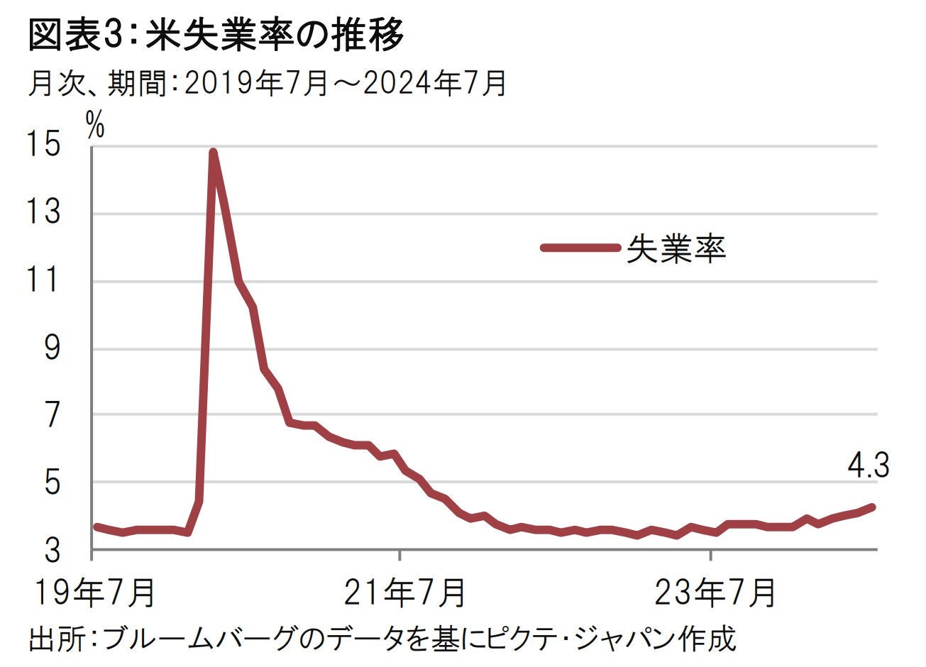 市場が米労働市場に注目したのは、7月の雇用統計で失業率が4.3%と、6月の4.1%を大幅に上回ったことが1つのきっかけと思われます(図表3参照)。失業率の変化率に注目して失業率と景気後退の関係を示唆する「サーム・ルール」が7月に0.53と景気後退入りの目安となる0.5に抵触したことが不安を高めた背景とみられます。仮に失業率上昇の背景が求人件数などの大幅な減少を伴うものであれば、失業率は急速に悪化することも懸念されます。サンフランシスコ連銀のデーリー総裁など早くから米労働市場の変調の可能性を指摘してきたFOMC参加者などは、失業率が加速度的に悪化する傾向があることを指摘しています。金融政策の対応としては、データが本格的に悪化するのを待つのではなく、大胆に前倒しで対応することが求められています。