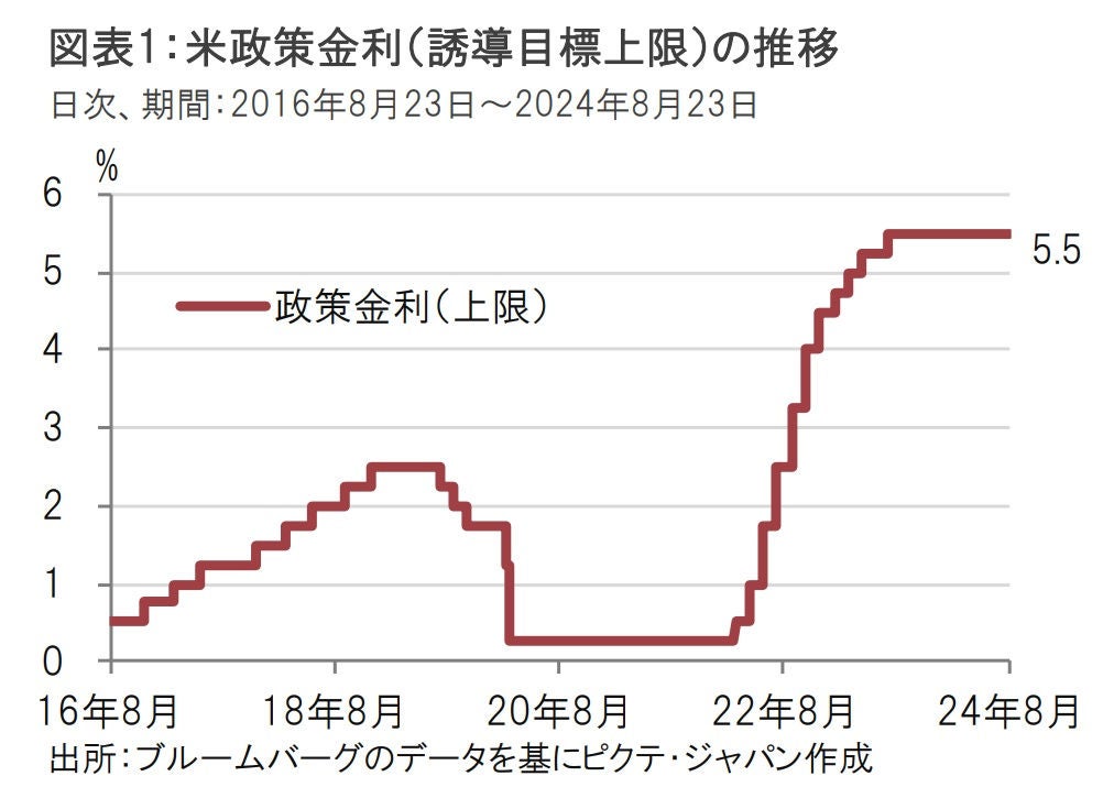 カンザスシティ連銀主催の経済シンポジウム「ジャクソンホール会議」が8月22日に開幕しました。米連邦準備制度理事会(FRB)のパウエル議長は23日の講演で、「政策を調整すべき時が来た」と述べました。これにより、パウエル議長は次回9月の米連邦公開市場委員会(FOMC)で、利下げ開始がほぼ確実であることを示唆しました。仮にその通りなら、22年3月の利上げ開始後、4年半ぶりの利下げとなります(図表1参照)。