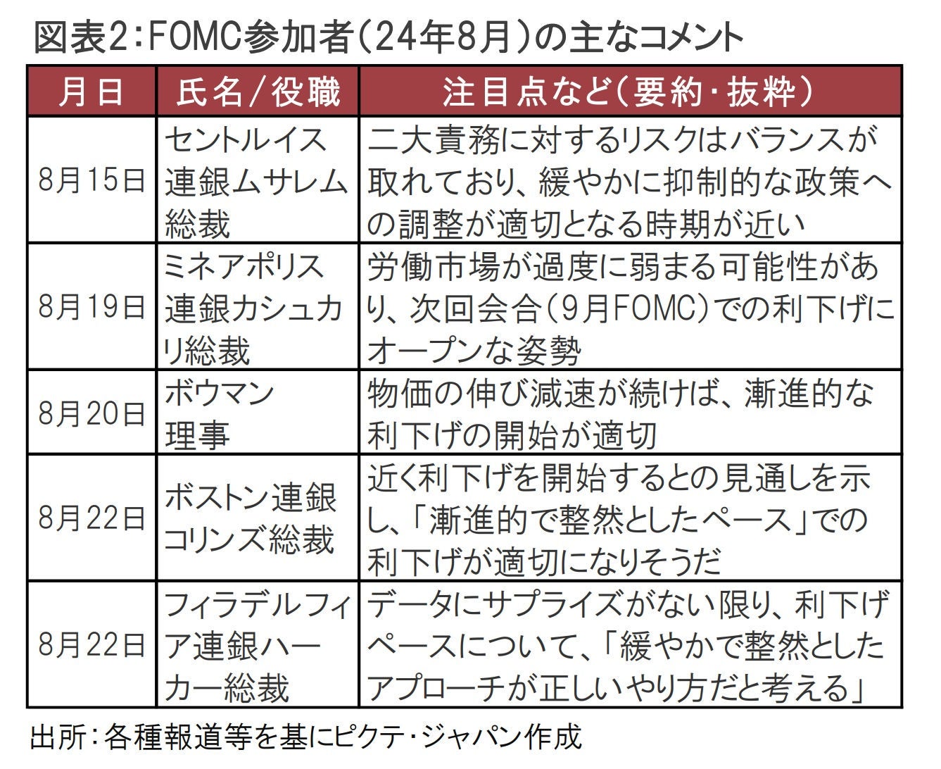 FOMC参加者の最近(8月)の主なコメントから、9月の利下げ開始はコンセンサスとみられます。タカ派(金融引き締めを選好)の代表格で、最近まで年内据え置きを主張していたボウマン理事も利下げ開始を支持していることなどが理由です。