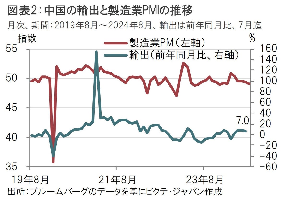 なお、図表2にあるように、中国の製造業PMIと輸出には相関がみられます。「世界の工場」ともいわれる中国ゆえ、中国の生産活動は輸出と密接に関連しているようです。8月の製造業PMIの内訳をみると生産指数は49.8と、今年2月以来の50割れとなり生産活動も悪化しました。中国国家統計局は発表文で、今回の製造業活動の縮小の原因は高温や豪雨、一部産業における季節的な生産停滞が原因と説明しました。天候要因が生産活動を押し下げたことに疑問はありません。問題なのは8月の新規受注が48.9と、前月の49.3を下回っていることです。天候要因だけが問題なら、新規受注は悪化しないと思われます。