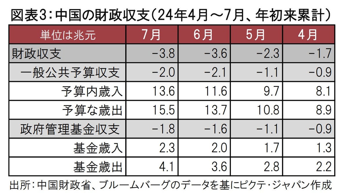 中国財政省が8月26日に発表した24年1~7月期の財政収支は約3.8兆元の赤字でした(図表3参照、マイナスは赤字)。一般公共予算、政府管理基金の各収支は2.0、1.8兆元の赤字でした。