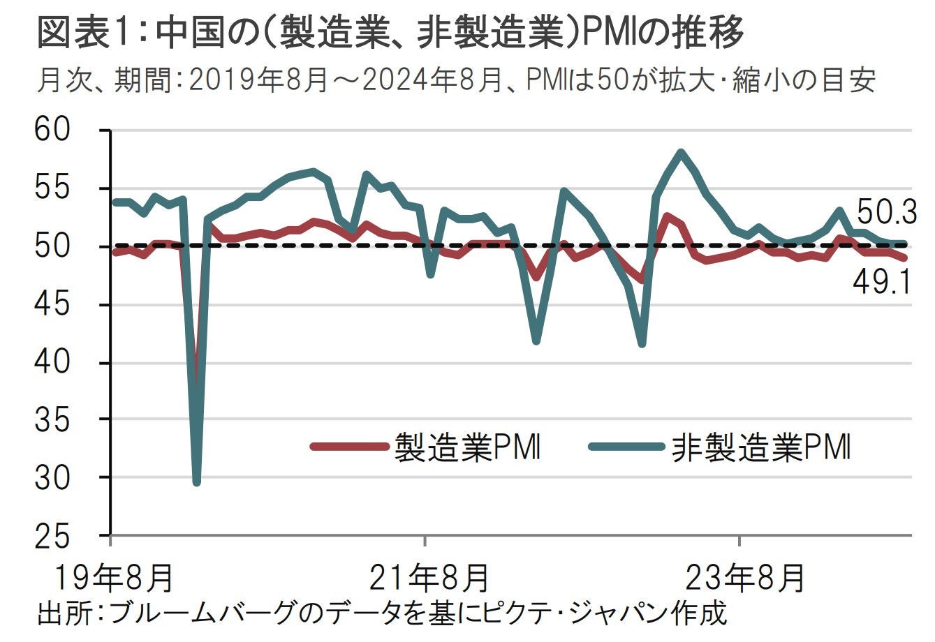 中国国家統計局が8月31日に発表した8月の製造業購買担当者景気指数(PMI)は49.1と、市場予想の49.5、前月の49.4を下回りました(図表1参照)。非製造業PMIは50.3と、市場予想の50.1、前月の50.2を小幅に上回りました。PMIは50が景気拡大・縮小の目安ですが、製造業PMIは4ヵ月連続で50を下回り、回復の鈍さが示されました。