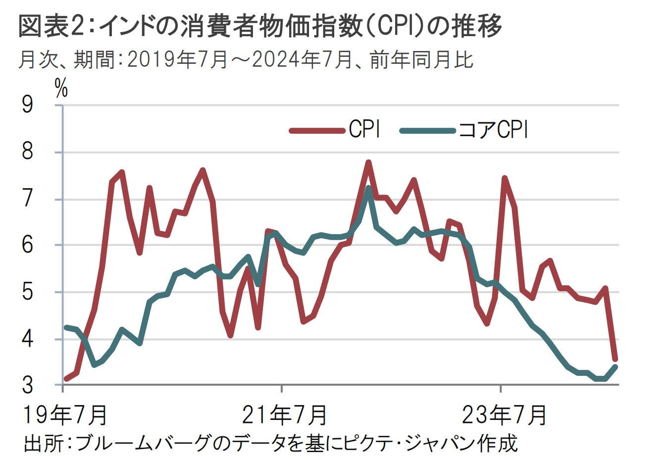 4-6月期の個人消費は前年同期比7.4%増と堅調で、これは22年7-9月期の8.2%増以来の強さです。今年のインドのモンスーン期(雨期)の雨量が平年を超えていることや、物価の落ち着き(図表2参照)などが背景と思われます。