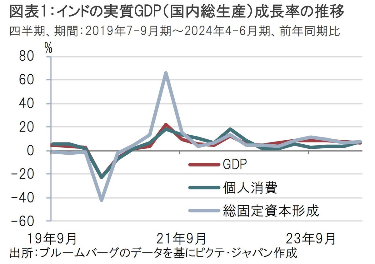インド政府が8月30日に発表した4-6月期の実質GDP(国内総生産)成長率は前年同期比で6.7%増と、市場予想の6.8%増、1-3月期の7.8%を下回りました(図表1参照)。