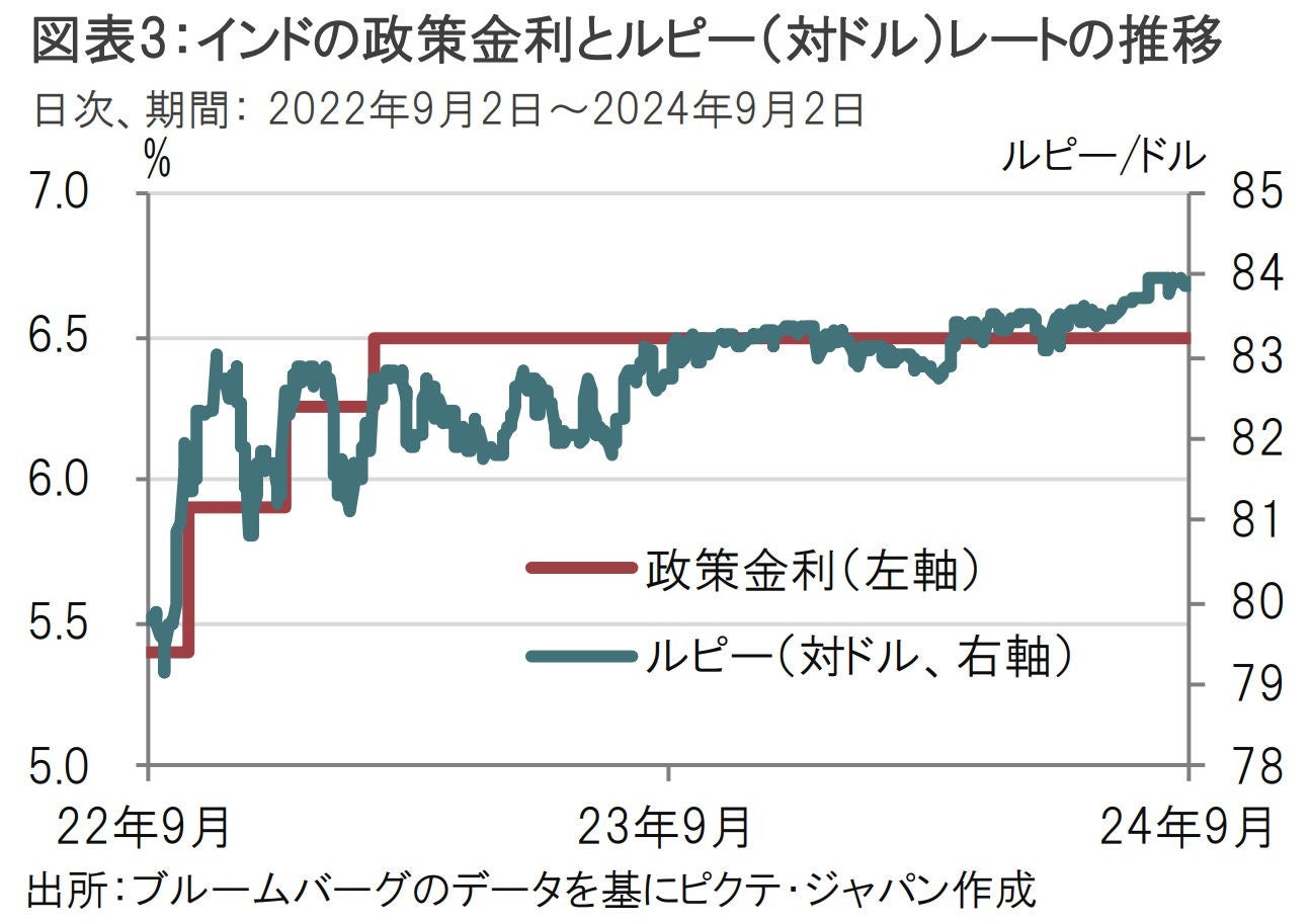 インド中銀は23年2月に政策金利を6.50%に引き上げてから8月会合まで政策金利を据え置いています。据え置きの背景のうち、海外要因は、ルピー安傾向である中、米国との金利差縮小がルピー安を加速させることを回避する必要があったことが主な理由とみています。