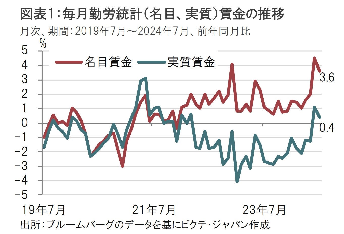 厚生労働省は9月5日に7月の毎月勤労統計調査(速報、従業員5人以上の事業所)を発表しました(図表1参照)。名目賃金を示す1人あたりの現金給与総額は前年同月比で3.6%増の40万3490円と、市場予想の2.9%増を上回りました。2年7ヵ月連続の増加となります。6月は4.5%増でした。6月から7月にかけての夏季賞与の支払いが増加の主な背景とみられます。