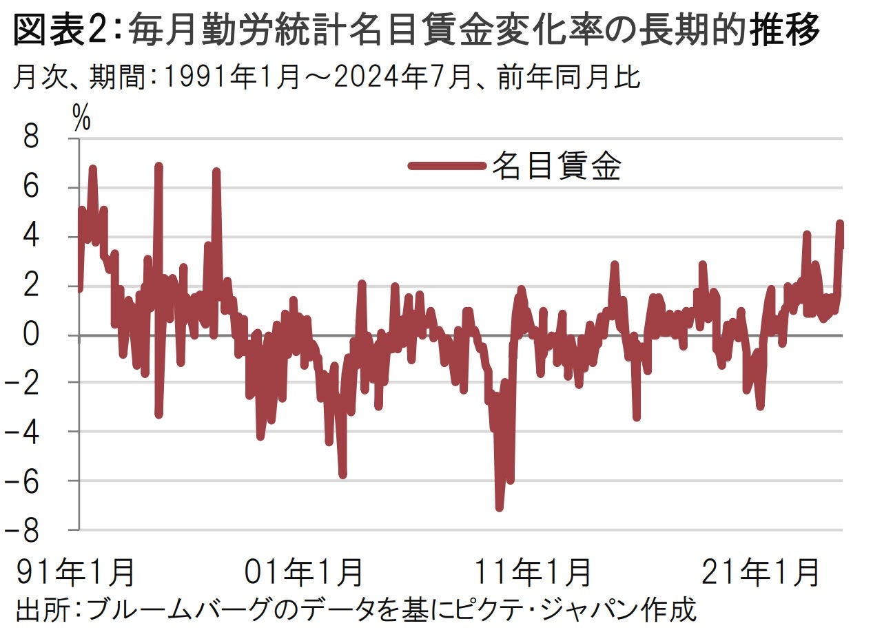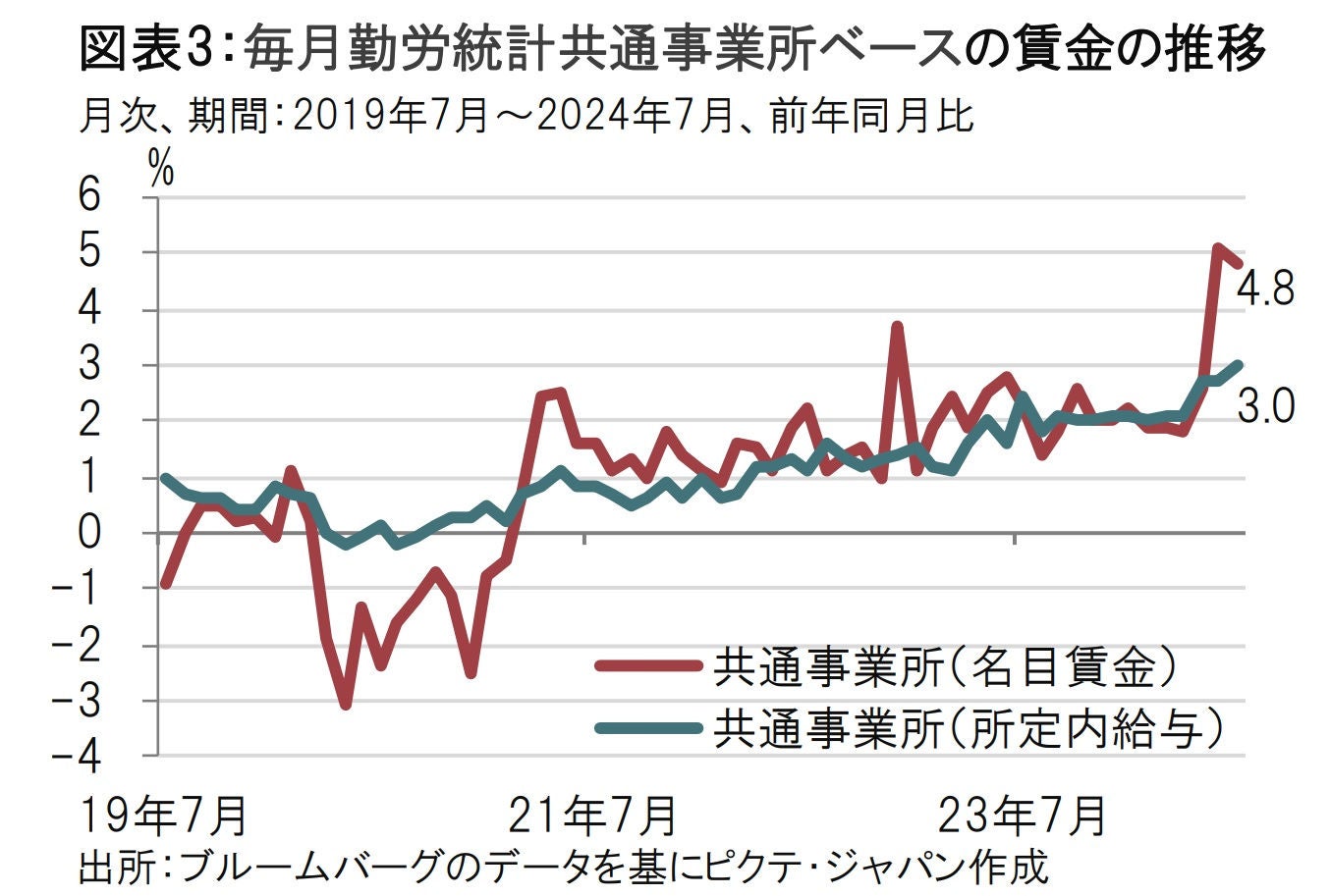なお、金融当局は毎月勤労統計調査を見るにあたり調査対象事務所に入れ替えの影響が少ない「共通事業所」ベースの数字にも注目しています。共通事業所ベースの名目賃金は前年同月比4.8%増と、前月の5.1%増は下回るも、市場予想の3.2%増を大幅に上回り、高水準の伸びを確保しました(図表3参照)。