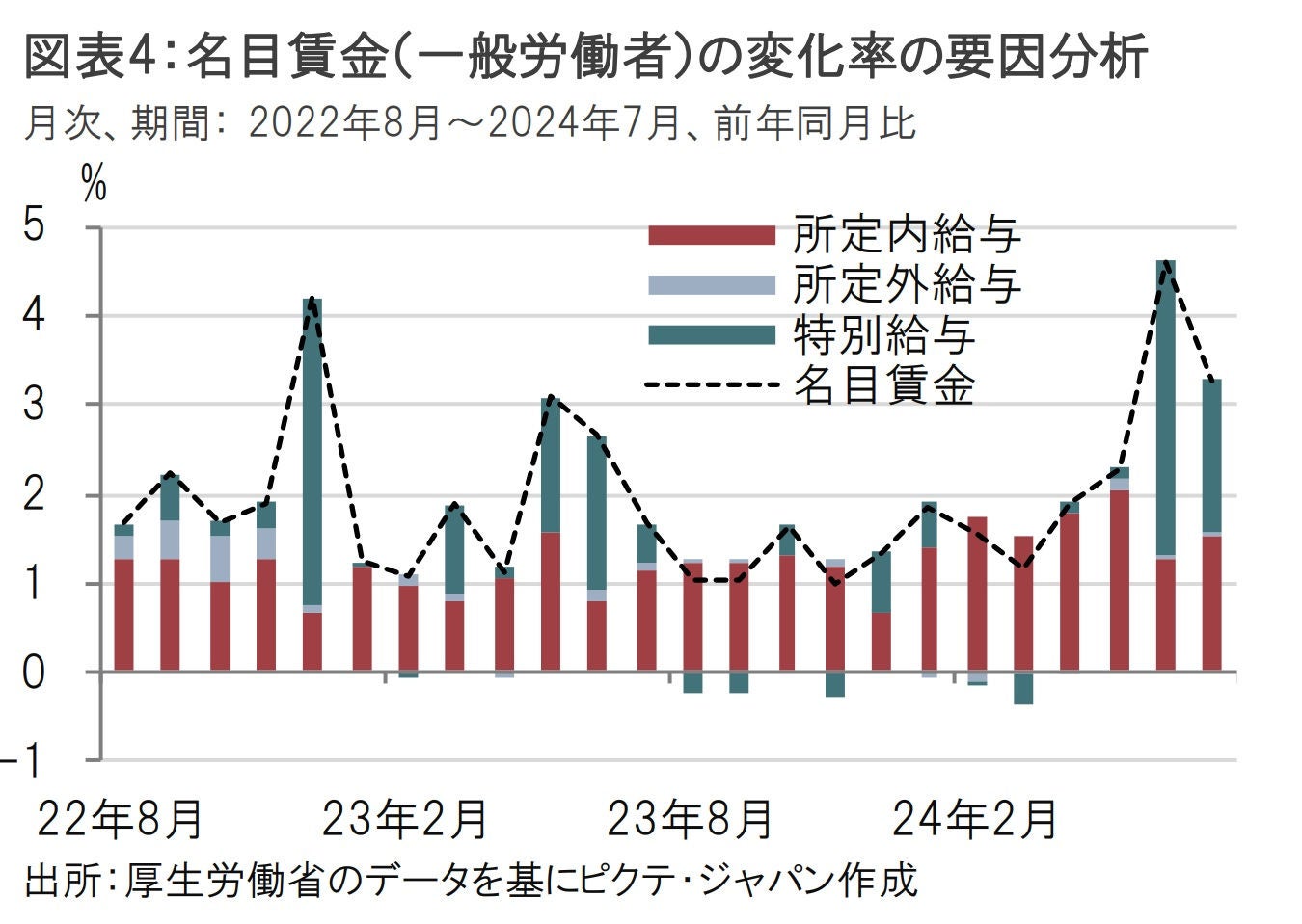 7月に3.6%増加した現金給与総額(名目賃金)の変動要因を寄与度で確かめます。名目賃金の変動を「所定内給与」、「所定外給与(時間外手当、休日出勤手当、深夜手当など)」、「特別給与」に分類しました(図表4参照)。なお、図表4の名目賃金は一般労働者のみを対象に分析しており、パートタイムの寄与は除いています。