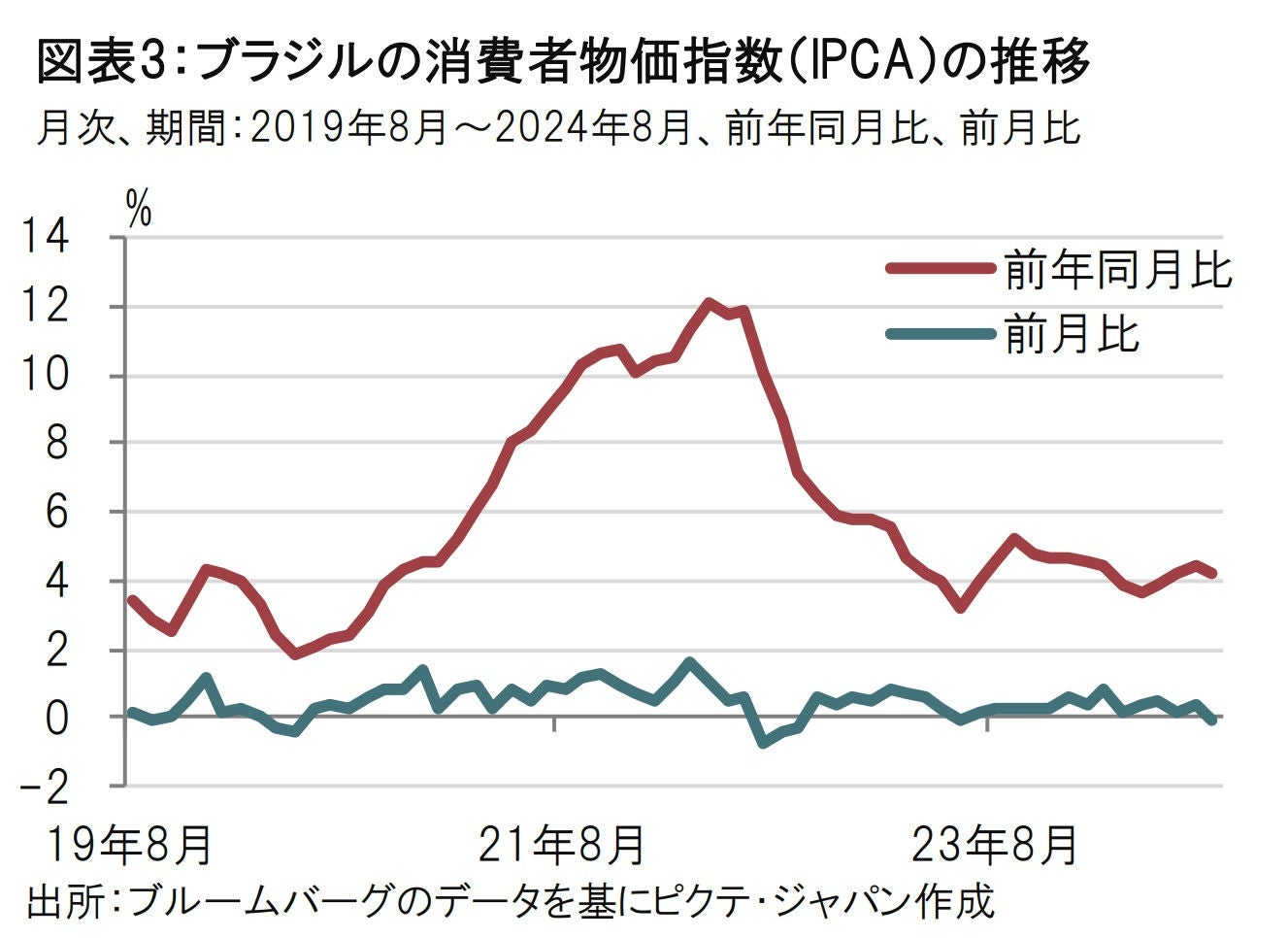 しかし、ブラジルのインフレ率はこの1年ほど4%前後で推移しています(図表3参照)。ブラジル中銀の物価目標の範囲(1.5%~4.5%)に概ね収まっています。もっとも、期待インフレ率は5%前後とやや懸念される状況です。それでも、ブラジルの実質金利は過去の平均(過去10年平均で4.6%程度)と比べても高いことから、ブラジルの実質金利はほぼ間違いなく景気抑制的な領域にあるとみられます。