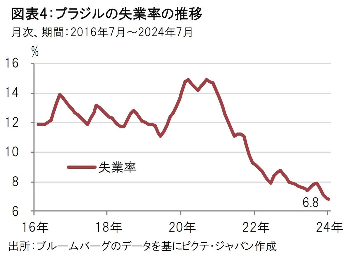 ブラジルは財政政策による支援もあり、内需を中心に景気は底堅く、4-6月期のGDP(国内総生産)成長率は前年同期比で3.3%増と、前期の2.5%増を上回りました。旺盛な内需を反映して輸入が拡大(前年同期比14.8%増)し、純輸出の寄与がない中でのプラス成長は、3.3%という数字よりも実感はより力強い成長とみられます。そうした中、ブラジルの7月の失業率は6.8%でした。コロナ禍や、15年~16年ごろの新興国経済の混乱期の失業率を大幅に下回っています(図表4参照)。