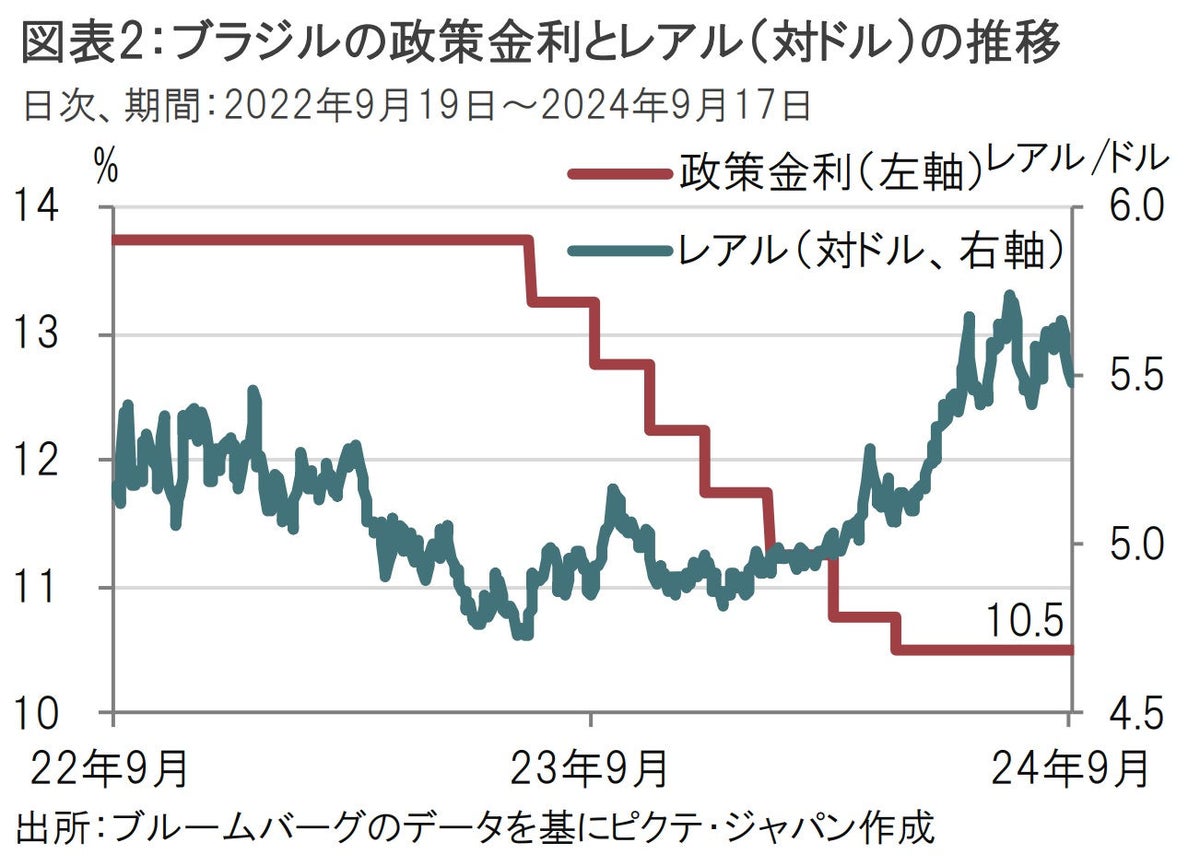 一方で、市場はブラジル中銀が9月の会合で政策金利を10.75%へ引き上げると予想しています(図表2参照)。ブラジルは利下げ開始が23年8月と他国に比べ先行していたことから、利上げに転じる機運が高まったという面はありそうです。