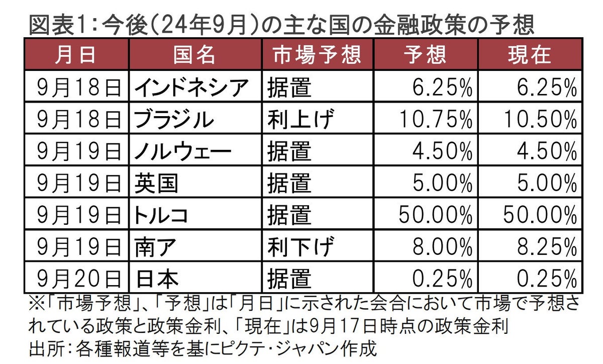 図表1の「市場予想」は、9月に会合を行う国々の金融政策の市場予想です。これを見ると多くの国で据え置きか利下げが予想されています。据え置きといっても、英国は7月末に利下げを開始しており、インドネシアやノルウェーも年内に利下げを開始するとみられます。そうした中、金融政策が周回遅れとなっている日本を除けば、利上げが予想されているブラジルは方向が異なっています。
