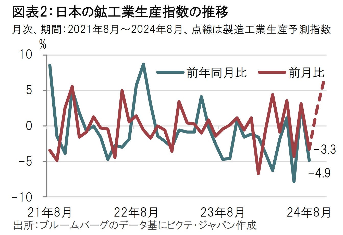 大企業製造業の景況感を振り返るため、8月の鉱工業生産指数を参照し動向を確かめます(図表2参照)。生産指数は前月比で3.3%減と、市場予想、前月を下回り、生産活動の弱さが示されました。部門別にみると自動車が前月比で10.6%減と大幅に悪化した一方で、電子部品・デバイス、自動車を除いた輸送機械などは堅調でした。自動車は台風10号による生産停止の影響を受けた一方で、半導体の根強い需要を受け電子部品・デバイスは堅調であったとみられます。