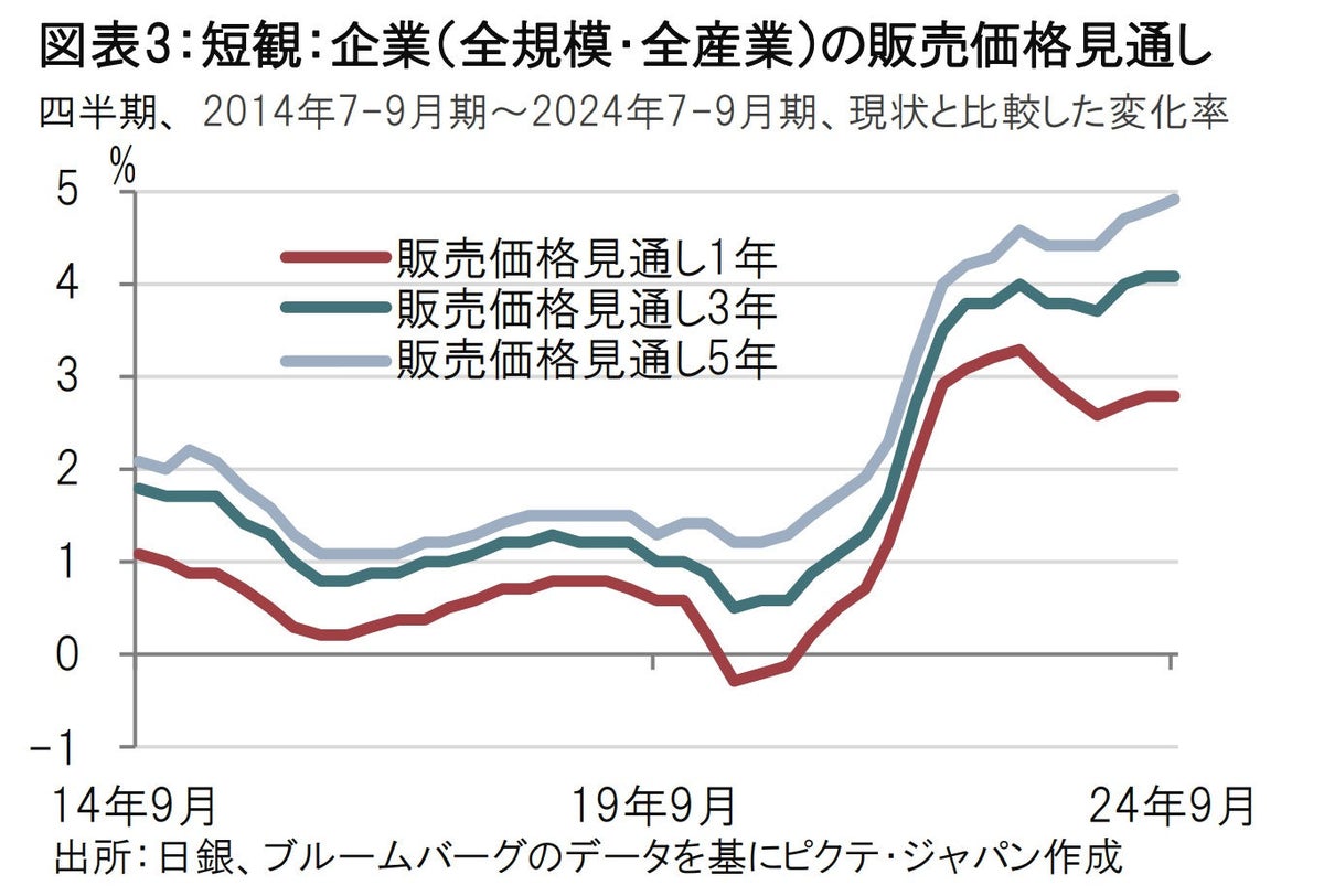 次に、企業の物価見通しを見ると、「物価全般の見通し」は1年後、3年後、5年後は各々2.4%、2.3%、2.2%で、6月調査からいずれも横ばいでした。また、価格転嫁の代替指数とみられる現状水準と比較した「販売価格の見通し」も全規模・全産業ベースでは6月調査からほぼ横ばいでした(図表3参照)。ただし一部のセクターに販売価格を引き下げる見通しもみられます。物価見通しは全体としてみれば安定しており、また5年という長期では価格を引き上げる意向も残っています。ただ、1年や3年先の価格を押し上げる意欲は前回調査に比べやや後退したようにも見受けられます。