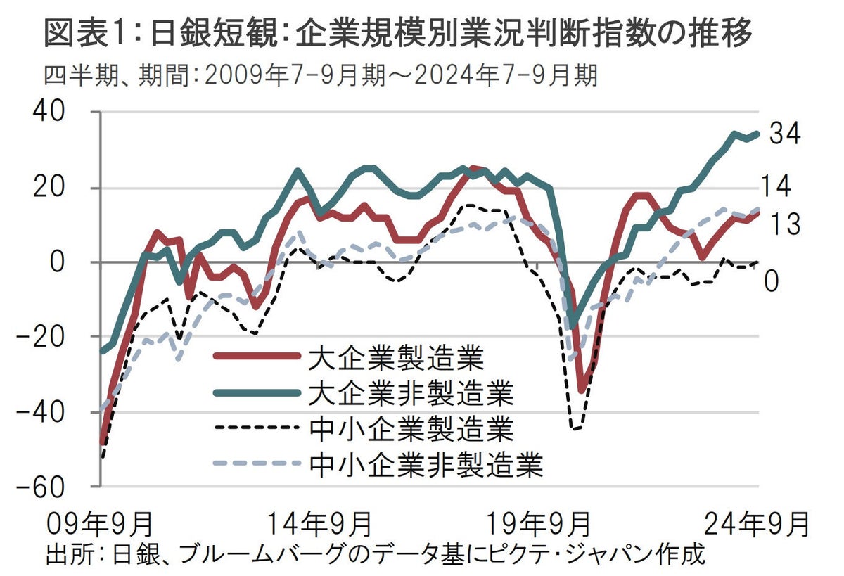 日本銀行は10月1日に全国企業短期経済観測調査(短観、9月調査)を発表しました(図表1参照)。大企業製造業の景況感を示す業況判断指数(DI)は13と、前回6月調査から横ばいでした。市場予想は12と悪化を見込んでいました。先行き指数は14と改善を見込んでいます。大企業非製造業の業況判断指数は34と、市場予想の32を上回り、前回6月調査の33から1ポイント改善しました。ただし、大企業非製造業の先行き指数は28と悪化が見込まれています。