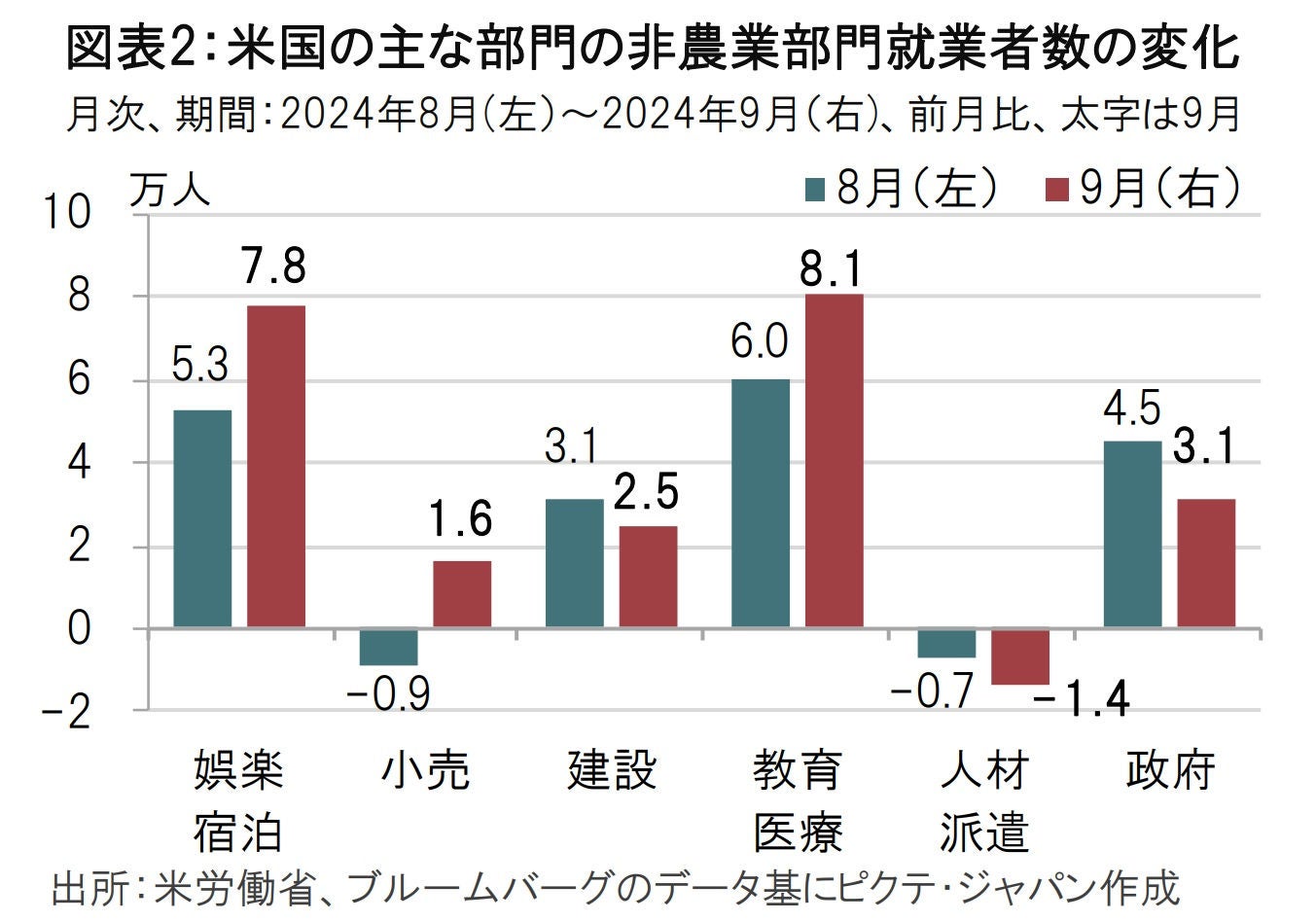 就業者数の伸びを部門別にみると、雇用の伸びは「教育・医療」、「娯楽・宿泊」、「政府」に偏っています(図表2参照)。ただし、「建設」は前月を下回るも2.5万人増と堅調な伸びを確保し、また「小売」は前月比で1.6万人増でした。3日に発表された9月の米ISM非製造業景況指数は54.9と堅調な数字となったこととも整合的で、9月の雇用回復は部門別に若干の幅広さも見られました。