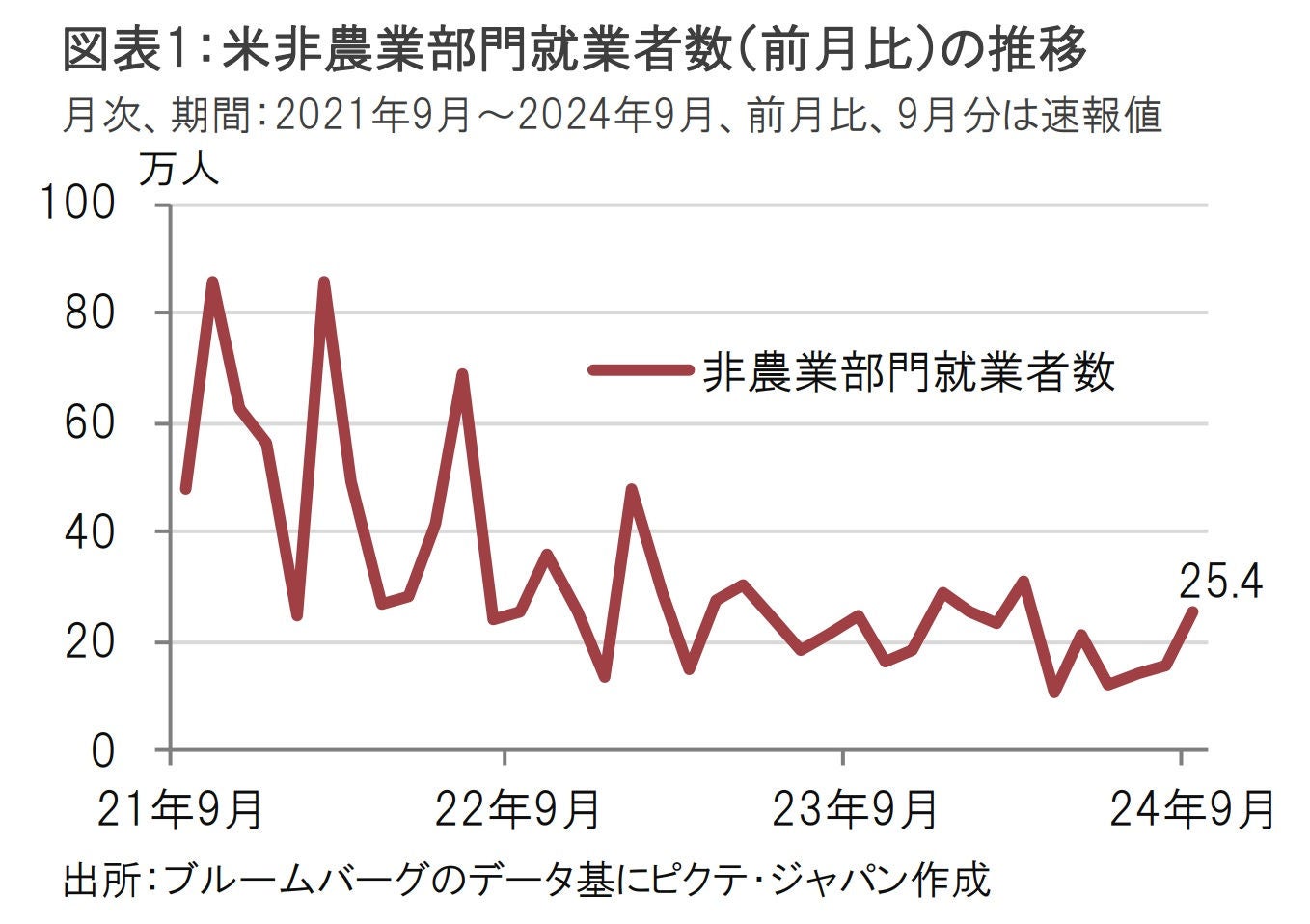 米労働省が10月4日に発表した9月の雇用統計によると、非農業部門の就業者数は前月比で25.4万人増と、市場予想の約15万人増、前月の15.9万人増を大幅に上回りました(図表1参照)。7月の就業者の伸びは8.9万人から14.4万人に、8月は14.2万人から15.9万人にそれぞれ上方修正されました。