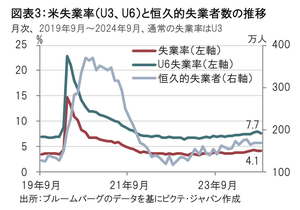 失業率は4.1%と前月を下回りました(図表3参照)。7月の雇用統計以降、市場で注目されている「サーム・ルール」(景気後退との関係を示唆する統計的法則で直近3カ月間の平均失業率が過去1年の最低値を0.5上回れば、景気後退が始まった可能性を示唆)は9月が0.50と、前月の0.57を下回りました。突如として高まった景気後退懸念は、今回の数字で後退するように思われます。