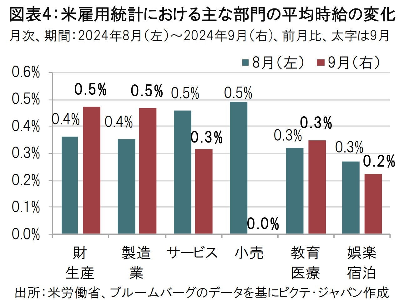 部門別にみると(図表4参照)、平均時給の伸びが比較的高かったのは製造業などを含む財生産部門でしたが、同部門は雇用が加速したわけではないだけに、時間をかけてみる必要があります。