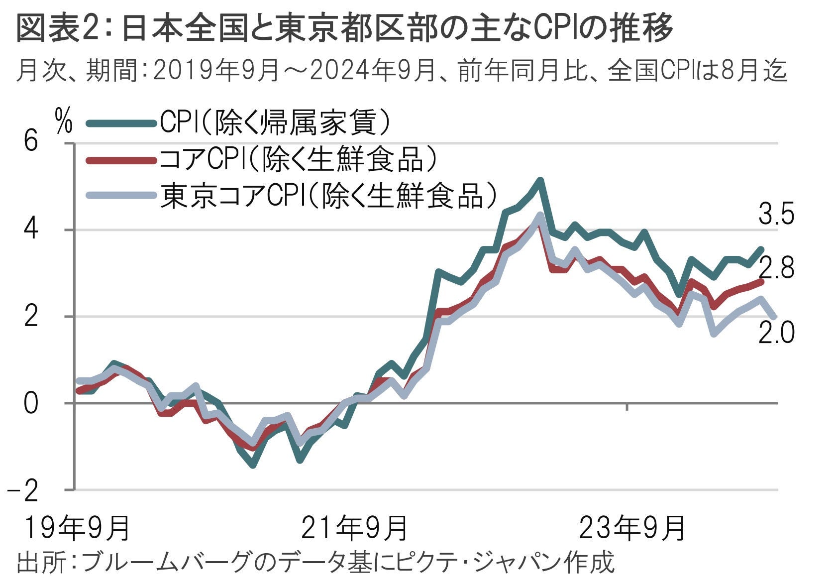 実質賃金が注目されることが多いことから、簡単に物価動向を振り返ります。日本全国の消費者物価指数(CPI)で生鮮食品を除いたコアCPIは8月が前年同月比で2.8%上昇しました。毎月勤労統計の実質賃金でインフレ率としてとして使用される全国CPI(除く帰属家賃)は3.5%上昇とやや高めとなっています。日本の帰属家賃(持ち家にも家賃負担があるとみなし換算)が低水準なことが背景と思われます。
