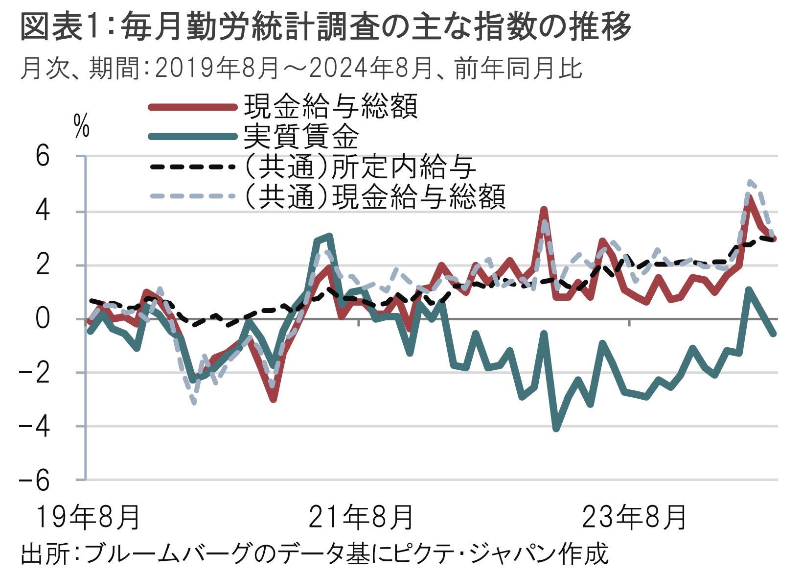 8月の実質賃金は6月、7月のボーナス急増の反動でマイナスとなった