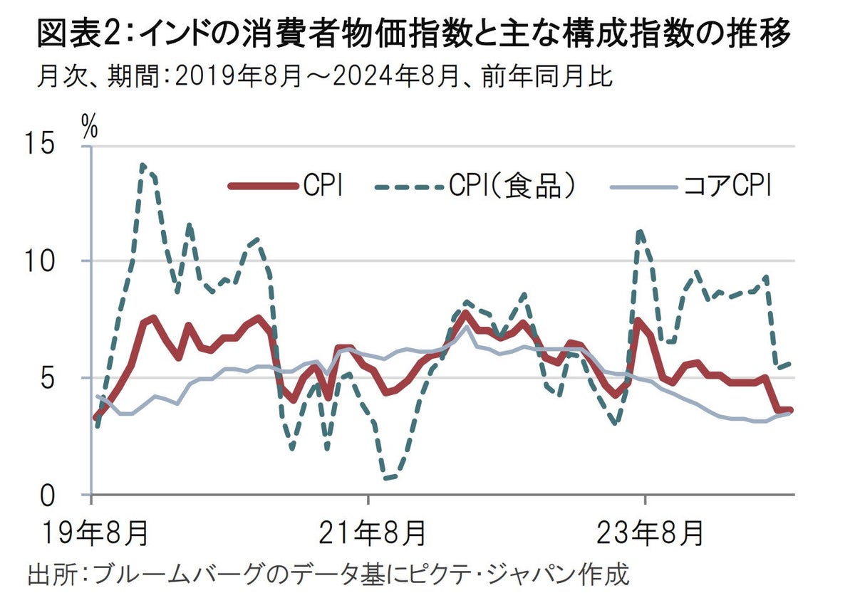 この背景を明らかにするため、インドのインフレ動向を振り返ります。インドの8月の消費者物価指数(CPI)は前年同月比3.65%上昇と7月とほぼ同水準でした(図表2参照)。インド中銀の物価目標である4%±2%に収まっています。インフレ鈍化の背景は昨年の7月、8月の急激な物価高の反動(ベース効果)です。昨年は雨期(モンスーン)の雨量が少なく野菜など食品価格が急上昇しました。食品CPIは8月が前年同月比で5.66%上昇と依然高水準ですが、昨年のピークの11.5%に比べ鈍化しています。