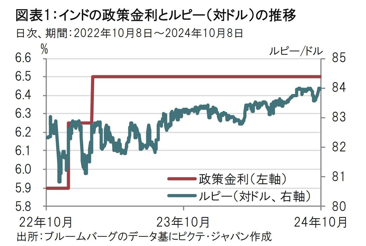 インド準備銀行(中央銀行)は10月7日~9日まで開催した金融政策決定会合で、政策金利(レポ金利)を6.5%で据え置くことを、賛成5、反対1で決定しました(図表1参照)。据え置きは10会合連続です。