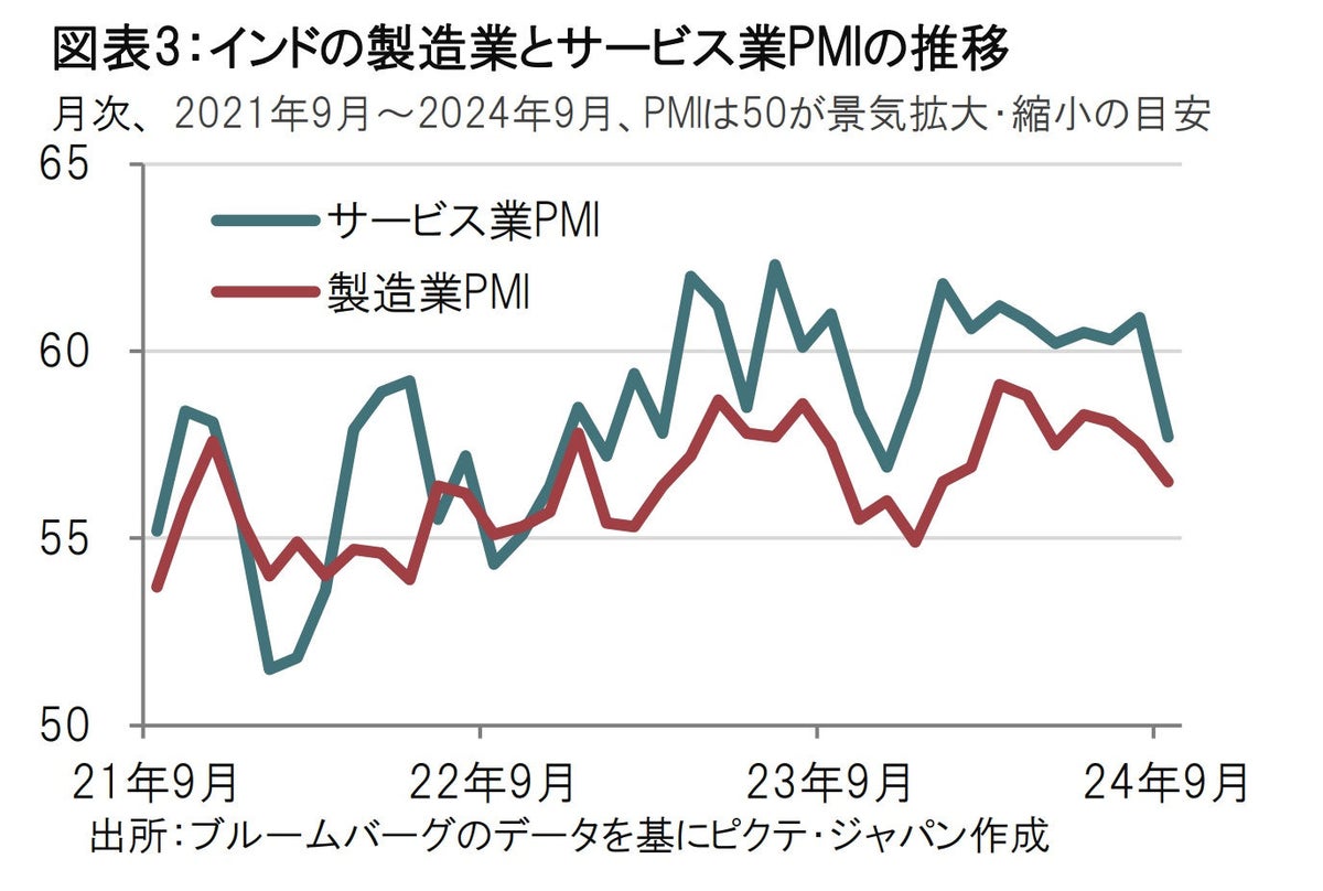 しかし、短期的な景気サイクルには鈍化の兆しもみられます。インドの製造業とサービス業の購買担当者景気指数(PMI)指数は足元でやや下向きとなっています(図表3参照)。