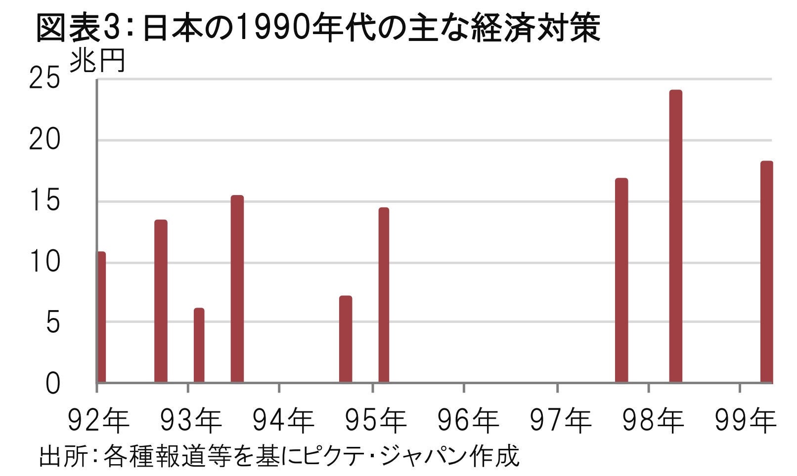 日本では90年代に「総合経済対策」、「新総合経済対策」などの名称で、いわゆる財政政策が実施されました。これらの財政政策に効果があったかというと後世の評価は一般に厳しいものとなっています。効果が不確実なばかりか、90年代後半になるほど、市場の期待などとともに、財政政策の規模が大きくなる傾向がみられました。日本の不動産問題が改善に向かうには長い道のりがありました。不良債権の透明化から買取機関の設置、痛手を負った銀行への資本注入や合併など長期にわたる取り組みがありました。