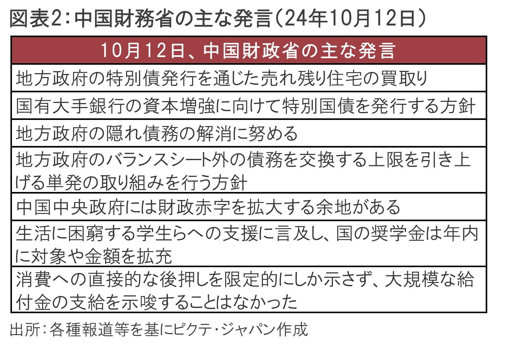 中国株式市場は4~5月にかけ、不動産市場対策への期待から上昇しましたが、発表後は失望感から株価が軟調になりました。しかし9月の経済対策は株式市場への流動性供給など想定以上の対策が盛り込まれ、株式市場は先月末急上昇しました。ただし、①~③の経済対策には財政政策が示されませんでした。そうした中、10月12日に藍仏安財政相は財政政策について発言しました(図表2参照)。主な内容は、地方債務リスクを軽減し、国有銀の資本不足を補い、不動産セクターを下支えする、などであり、お題目としては市場の期待に概ね沿うものとみられます。ただし、規模が不明な点など、市場が満足する内容とは言い難く、15日の中国株式市場は、軟調で経済対策後の株高維持に疑問も残りました。
