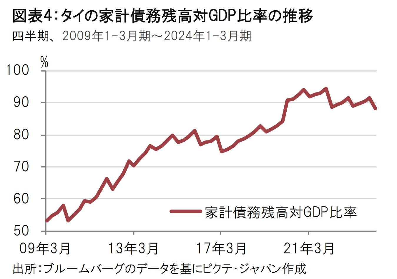 ただし声明文は利下げの理由がいくつも書き並べてありますが、何が利下げの決め手なのかを特定するのは困難です。あえて選ぶとすると、タイでは家計債務残高対GDP(国内総生産)比率が90%前後で高止まりしていることが挙げられます(図表4参照).。声明文では利下げにより返済負担を減らす必要性を指摘しています。
