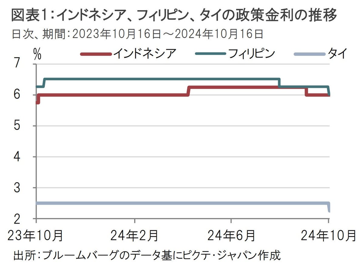 インドネシア、フィリピン、タイの各中央銀行は10月16日に金融政策を発表しました。インドネシアは金利を据え置き、フィリピン、タイは共に政策金利を0.25%引き下げました。米国金利との感応度が一般的に高いアジアの国々の金融政策は9月の米国の利下げが大なり小なり影響するものとみられます。しかし、それでも各国中央銀行は自国の経済状況に応じて金融政策を運営することに努めているようです。