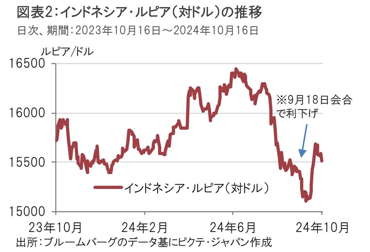 インドネシアは今会合では据え置きました。インドネシア中銀は伝統的に通貨ルピアの安定を意図した金融政策運営を行います(図表2参照)。9月の米連邦公開市場委員会(FOMC)では利下げが確実視(実際の利下げ幅は0.5%)されていたことから、インドネシア中銀はFOMC直前の9月会合で利下げを決定しました。通貨ルピアは9月会合後もしばらく強含みましたが、10月月初からルピア安に転じました。月初に発表された米雇用統計が堅調で、米国の利下げペースは緩やかとの観測がルピア安の背景とみられます。インドネシア中銀が10月会合で据え置いた要因の1つとみられます。