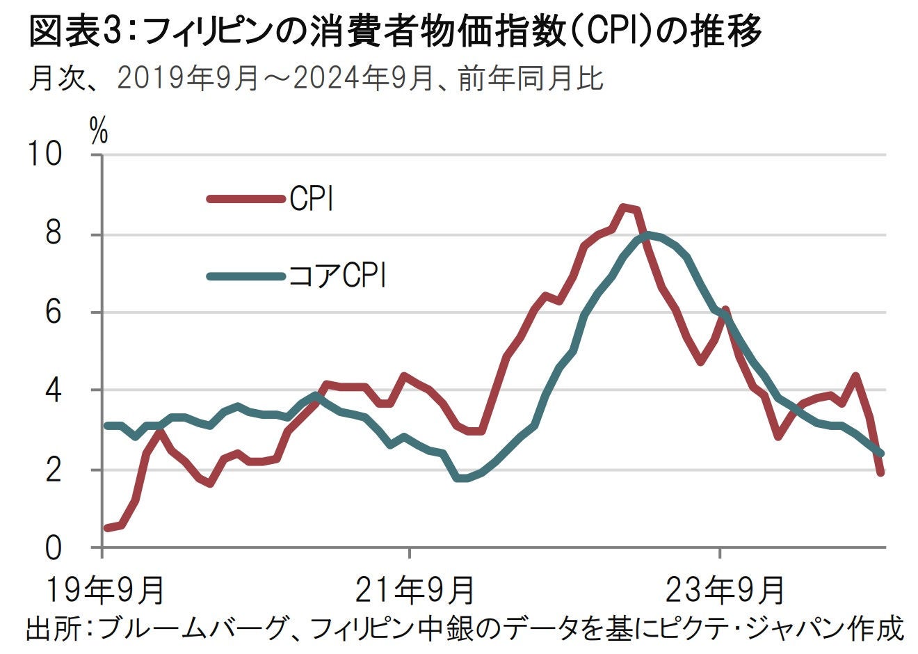 フィリピン中銀は声明文で今回の利下げをインフレ見通しが改善したためと説明しています。フィリピンの消費者物価指数(CPI)は9月が前年同月比1.9%上昇と、前月の3.3%上昇を大幅に下回りました(図表3参照)。食品CPIが9月は1.4%上昇と8月の3.9%上昇を大幅に下回ったことが主因です。変動の大きい項目を除いたコアCPIも2.4%と、前月の2.6%を下回りました。そのような中、フィリピン中銀は24年のインフレ見通しを3.1%と前回の3.3%から下方修正しました。25年と26年のインフレ見通しは上方修正しましたが物価目標に収まる水準です。フィリピン中銀は、通貨ペソの動向次第ながら、当面緩やかな利下げ姿勢とみています。