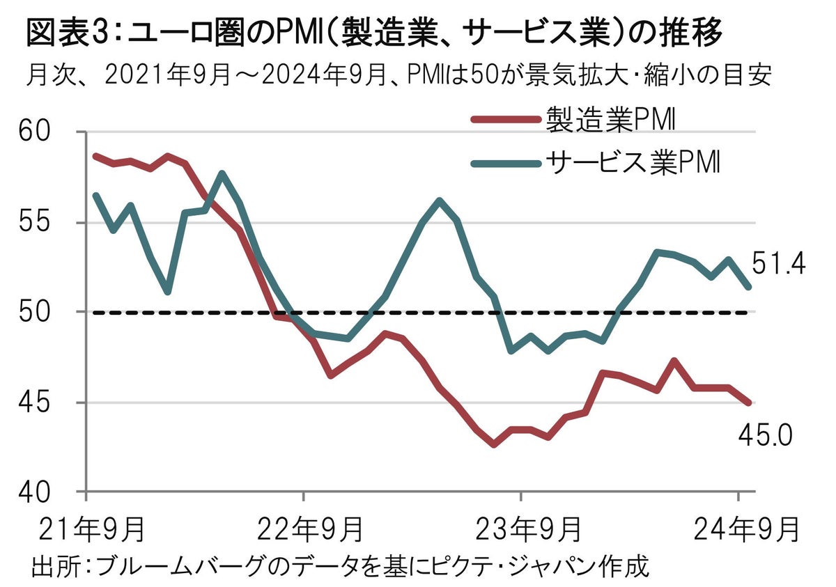 ユーロ圏の景気について会見では鉱工業生産指数や製造業とサービス業の購買担当者景気指数(PMI)などに言及しました(図表3参照)。ラガルド総裁は会見で、景気鈍化を認める発言をしています。ユーロ圏の景気を懸念する声はタカ派(金融引き締めを選好)の重鎮であるシュナーベル理事からも聞かれました。シュナーベル理事は10月2日に「経済成長への逆風を無視できない」と発言しているからです。全会一致となった今回の利下げでは景気への配慮も共有されていたようです。