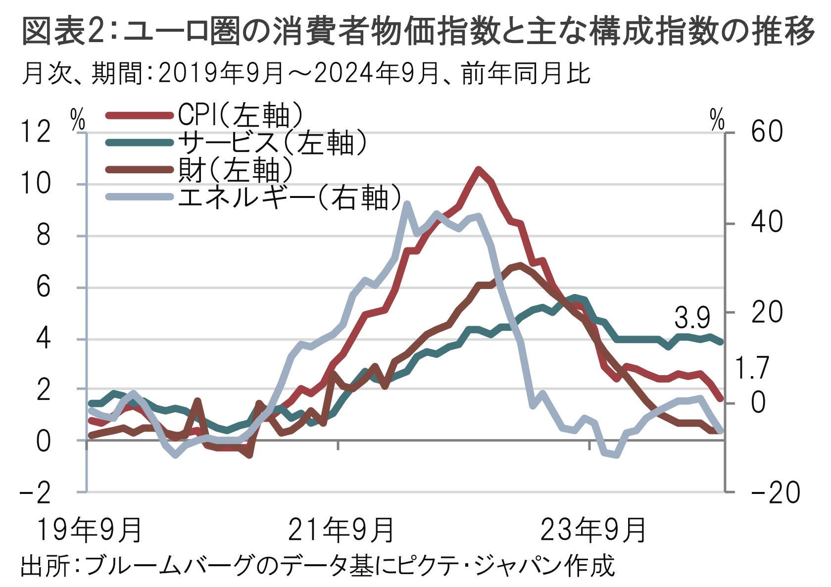 まず、ユーロ圏のインフレ率を振り返ります(図表2参照)。10月会合と同日に、利下げを支持するインフレ指標が発表されました。9月のユーロ圏の消費者物価指数(CPI、欧州連合(EU)基準)は前年同月比で1.7%上昇と、速報値の1.8%上昇から下方修正されました。ECBの物価目標の2%を下回る水準で、インフレ鈍化が明確なことから、声明文ではインフレ率が目標値まで低下する時期を従来の25年7-12月を25年に前倒ししました。