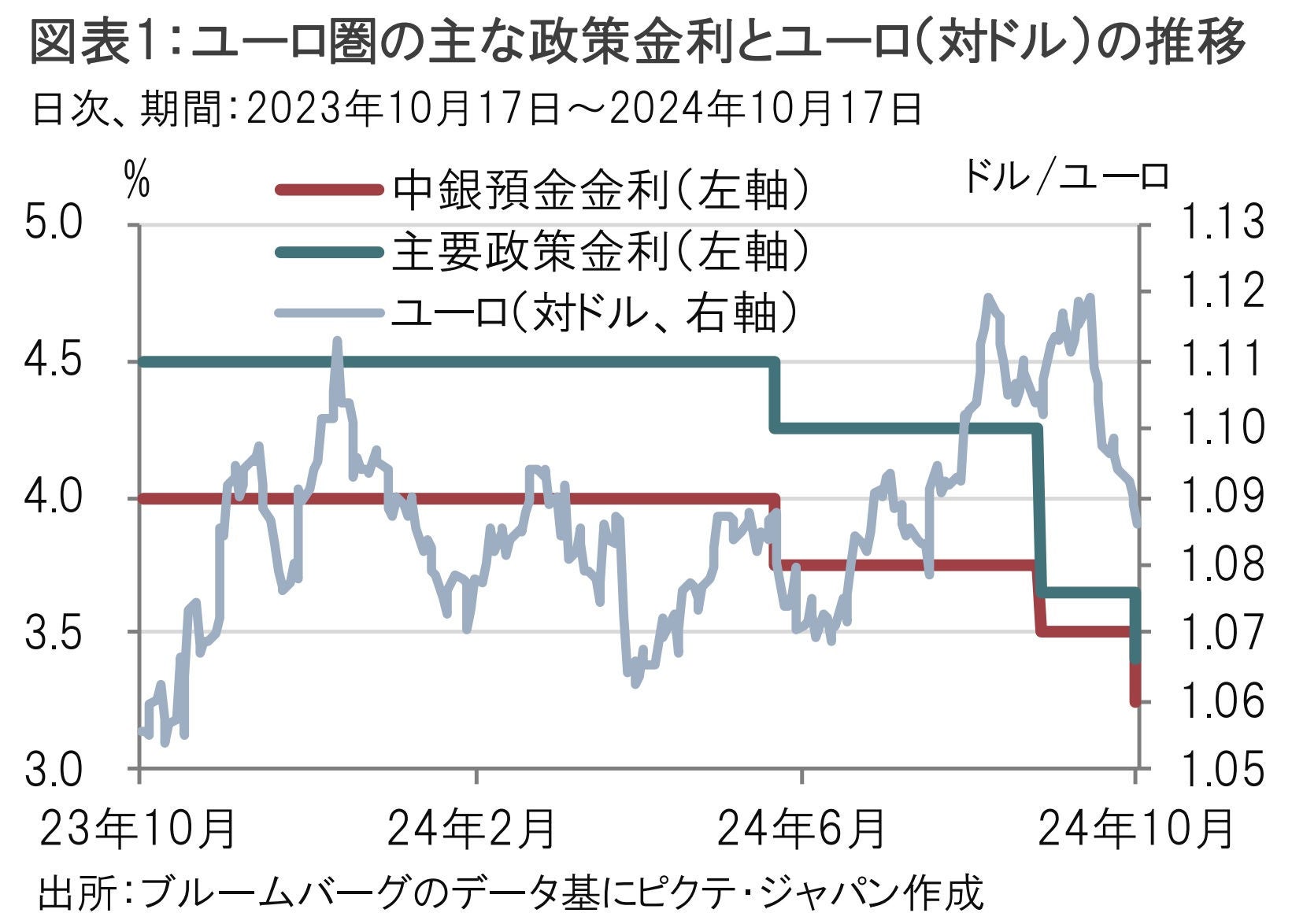欧州中央銀行(ECB)は10月17日に開催した政策理事会(会合)で政策金利と位置付ける中銀預金金利を3.50%から0.25%引き下げ3.25%とすることを決定しました(図表1参照)。ECBは6月に利下げを開始し、7月は据え置きとしましたが、9月、10月と2会合連続での利下げとなりました。