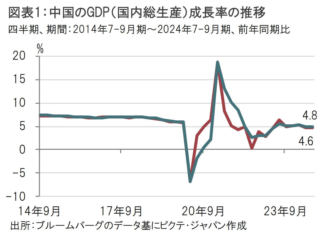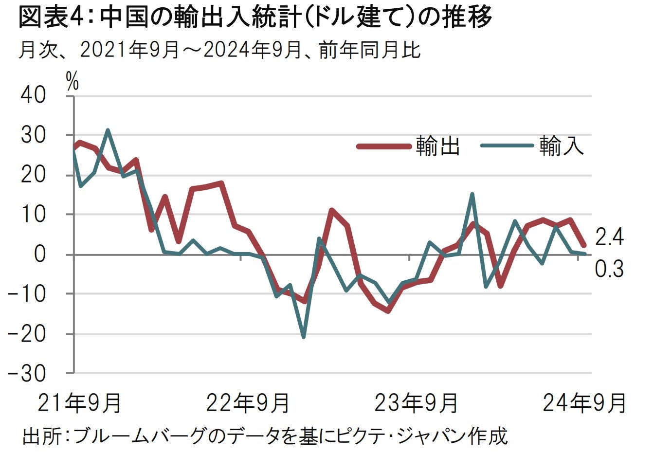 中国の7-9月期GDPは前年同期比で4.6%増と市場予想を上回りましたが、前期を下回る成長率にとどまりました。住宅市場は低迷し、消費や生産の回復も鈍いことなどが背景です。そのうえ輸出にも悪化の兆しがみられるなど、中国の経済成長の今後に注意が必要です。「5%前後」とされる24年の経済成長目標の場合達成に疑問もある中、中国当局は足元で金融・財政政策を繰り出す構えです。