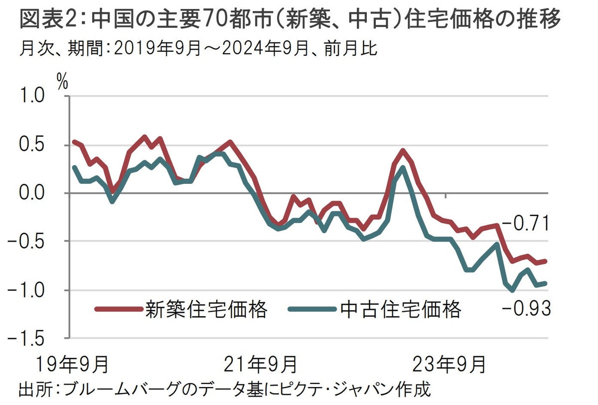 住宅市場は回復感が乏しくなっています。GDPと同日に発表された9月の主要70都市の新築住宅価格は前月比0.71%の下落となりました(図表2参照)。取引価格が比較的自由で市場の需給を反映しやすい中古住宅価格指数は0.93%下落しました。中古物件は全ての都市で値下がりし、下落都市の数は8月より1都市増えるなど、住宅市場の回復感の乏しさが示唆されました。