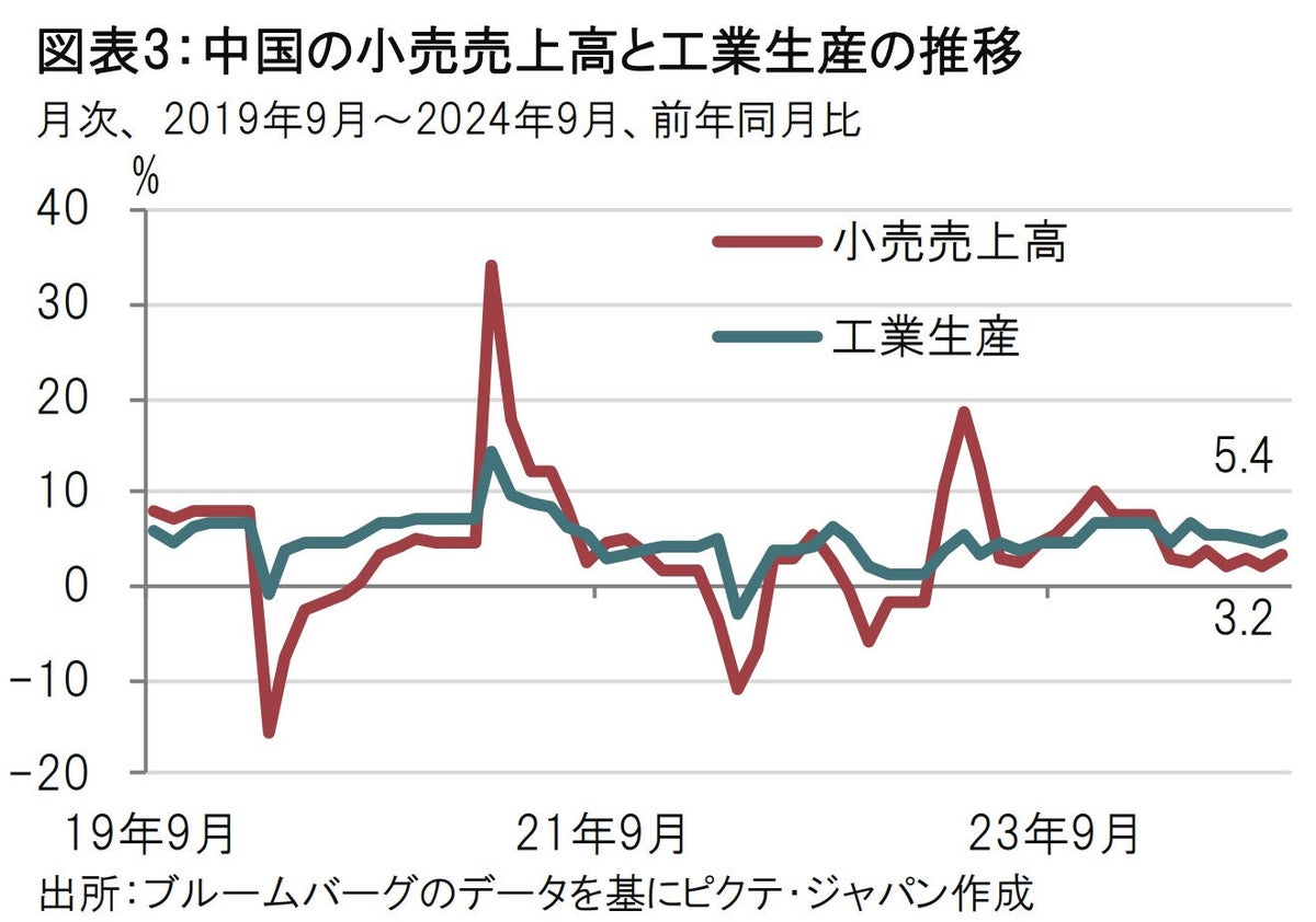不動産市場の悪化が消費者センチメントを悪化させているとみられますが、消費について9月の小売売上高を振り返ると(図表3参照)、前年同月比で3.2%増と、市場予想の2.5%増、前月の2.1%増を上回りました。飲食店が6.2%増となるなど明るい兆しが一部に見られました。