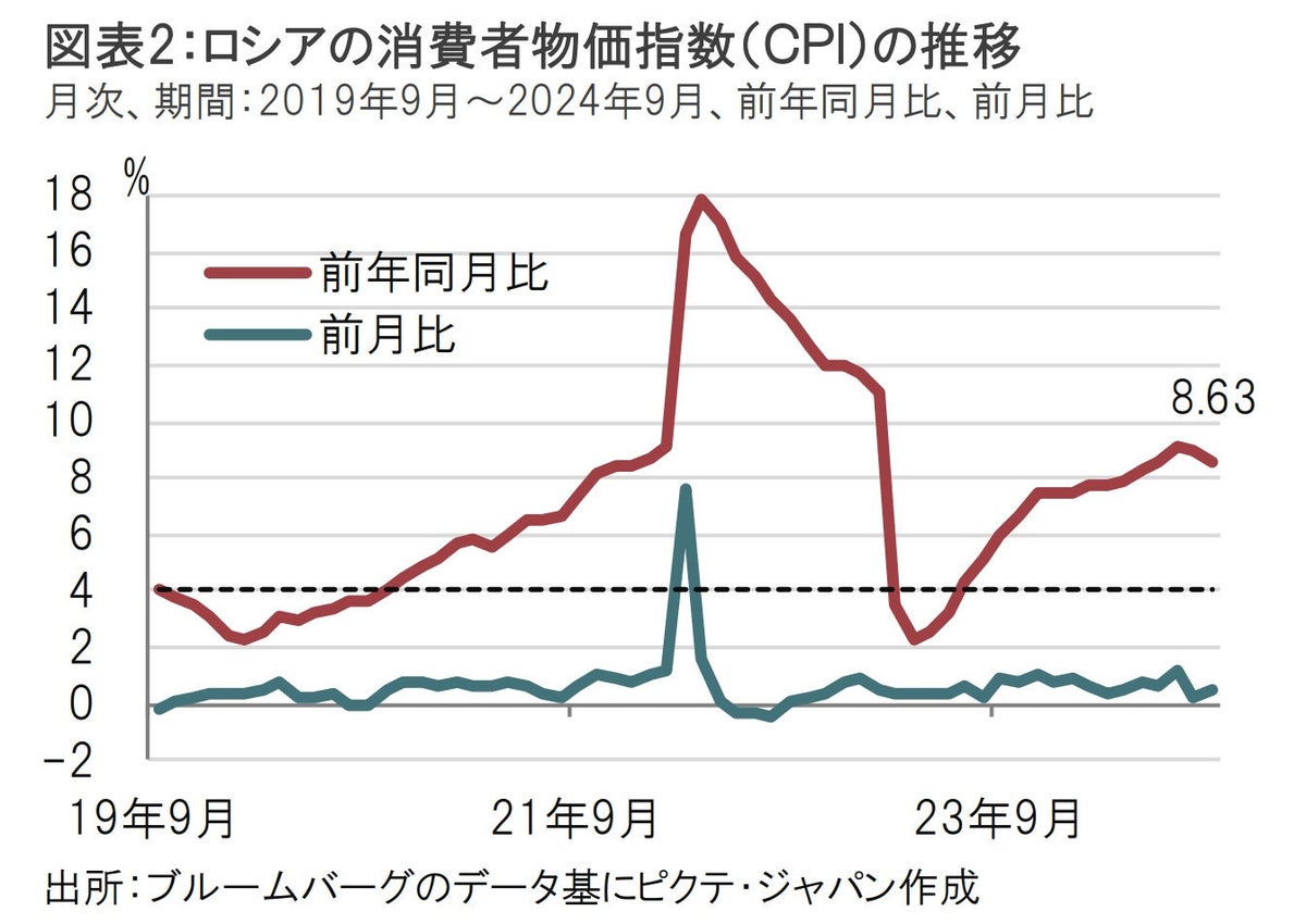 ロシアのインフレ率は物価目標を大幅に上回り、当面は引き締め姿勢