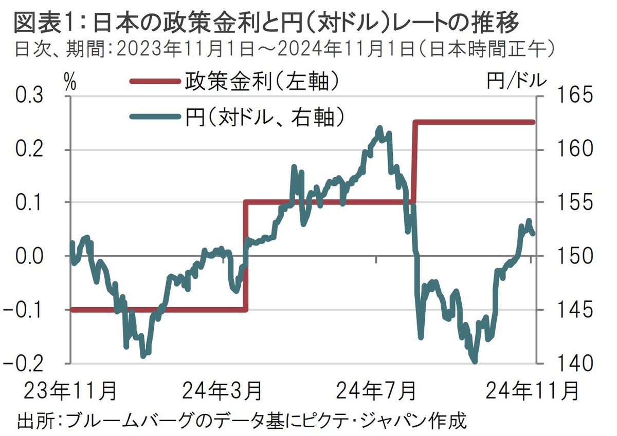 日本銀行は10月30~31日に開催した金融政策決定会合(会合)で、市場予想通り政策金利の据え置きを決定しました(図表1参照)。日銀は7月に利上げを決定した後、9月に続いて2会合連続で政策金利を据え置いていました。
