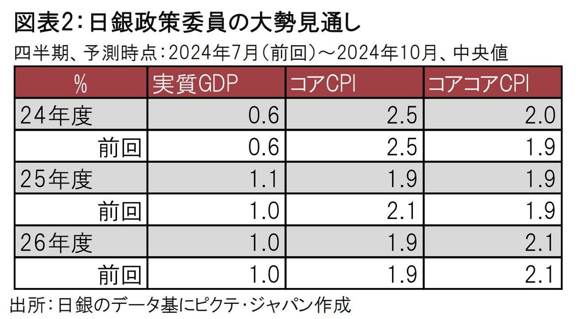 日銀のタカ派姿勢は展望レポートにも見え隠れしています(図表2参照)。まず、日銀政策委員の経済(大勢)見通しをみると、成長率、インフレ率とも24年度から26年度にかけて前回からの変更は小幅にとどめています。言外に、見通しの変更はほぼなく、経済・物価の見通しが「オントラック(想定通り)」であることを示唆しているように思われます。なお、25年度の消費者物価指数(除く生鮮食品、コアCPI)は前回の2.1%から1.9%に下方修正されました。しかし、展望レポートではこの点について、「このところの原油等の資源価格下落の影響などが押し下げ方向」となったと説明し、他の要因に問題がないことを匂わせています。
