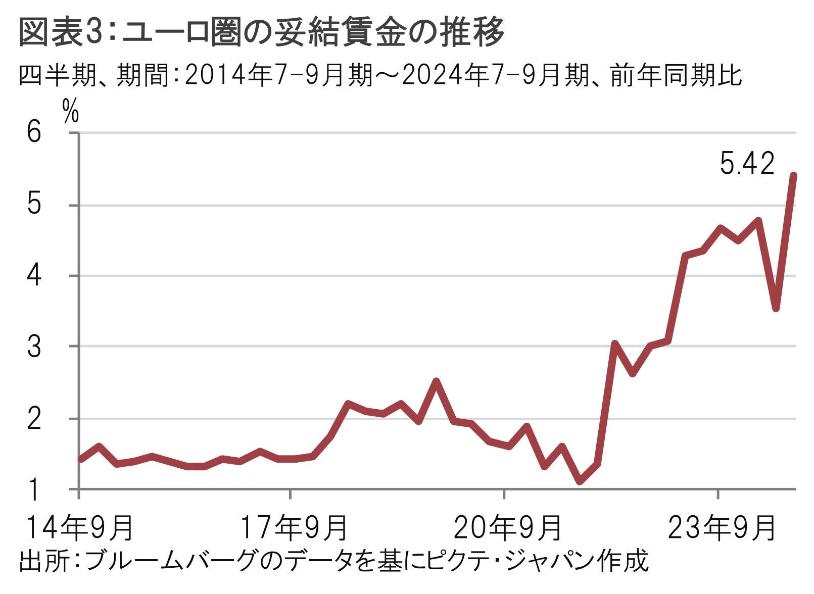 これまで述べてきたドイツが直面する課題から、ドイツの景気回復は当面鈍いことが想定されますが、景気底割れ回避を支持する要因も見られます。ユーロ圏の7-9月期の妥結賃金は一時金という持続性に疑問のある要因ながら前年同期比で5.42%と急上昇しました(図表3参照)。ユーロ圏のインフレ鈍化も加味すると実質賃金は大幅なプラスで、消費を下支えする可能性があります。